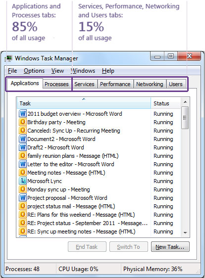 Когда мы изучили эти данные, а затем коррелировали их с интервью и наблюдениями за пользователями в наших научно-исследовательских лабораториях, мы обнаружили, что люди используют вкладку Процессы или чтобы найти что-то, чего нет в списке приложений (например, фоновый или системный процесс), или увидеть, какие процессы используют много ресурсов.