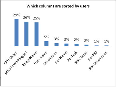 Результаты показывают, что люди проводят большую часть своего времени, используя первые две вкладки, которые содержат данные о приложениях и процессах. Было интересно видеть, хотя это и не удивило нас, что использование было примерно равномерно разделено между вкладками Приложения и Процессы. Это указывает на то, что должна быть некоторая существенная деталь, недостающая вкладке Приложения, которая заставляет людей переходить на вкладку Процессы. Затем мы рассмотрели, как люди используют вкладку Процессы, чтобы понять, что они там делают.