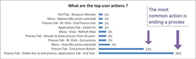 Благодаря инвестициям, сделанным нами в телеметрию, мы смогли запустить программу сбора данных, которая объединила отдельные потребительские интервью с наблюдением в научно-исследовательской лаборатории, чтобы понять, что люди делают с Диспетчером задач и как они это делают.