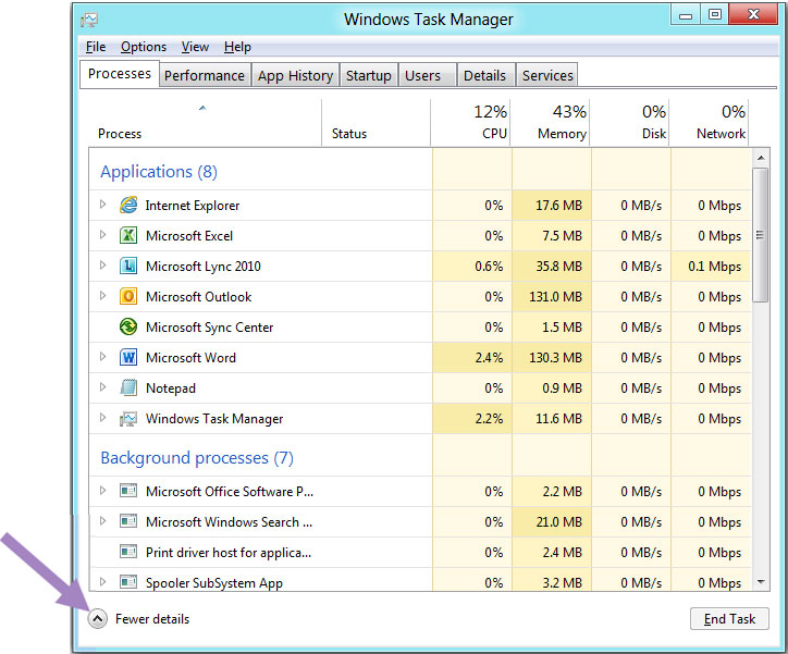 Сравните, насколько более прост и фокусируем новый Диспетчер задач по сравнению с Диспетчером задач Windows 7 с теми же самыми открытыми приложениями и окнами:
