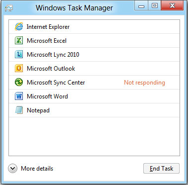 Мы знаем, что сторонние инструменты (или утилиты типа Process Explorer от Sysinternals) имеют много вещей, которые мы могли добавить в Диспетчер задач для опытных пользователей, но мы считаем, что сначала нужно уделить внимание обычным пользователям, поэтому мы не хотели создавать что-то, что приведет в замешательство большинство наших клиентов. Мы, конечно, будем продолжать оценивать сторонние инструменты, поскольку они учитывают специализацию и содержат уникальные новшества для этого круга задач. Для представления по умолчанию мы разработали минималистский интерфейс, который удовлетворяет потребности самой широкой клиентской базы в наиболее распространенных сценариях. Когда вы запускаете Диспетчер задач в Windows 8, вы отчетливо видите свои рабочие приложения. Мы сделали представление по умолчанию сильным в одном: завершении неправильно себя ведущих приложений. И мы убрали все, что непосредственно не поддерживает этот базовый сценарий.
