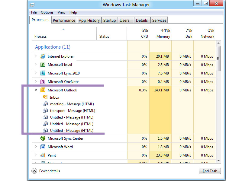 Больше всего неудобств в старом Диспетчере задач доставляло то, что вкладка Приложения была плоским списком, который включал все высокоуровневые окна всех процессов в системе. В то же время список высокоуровневых окон содержит интересную информацию, которая иногда имеет большое значение, помогая определить, можно ли закрыть текущее окно, не закрывая других окон приложения. Новый Диспетчер задач теперь группирует высокоуровневые окна под их родительским процессом. Это создает более понятное представление для типичных сценариев и помогает вам сосредоточиться на завершаемых процессах, оценить использование ресурсов, также позволяет видеть, какие окна принадлежат каждому процессу, таким образом, вы знаете что будет закрыто, если вы завершите данный процесс.