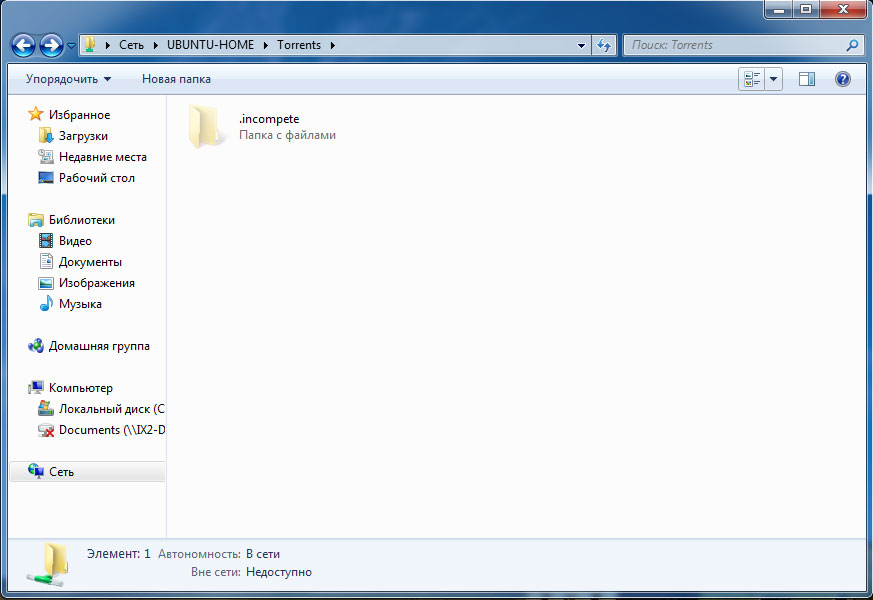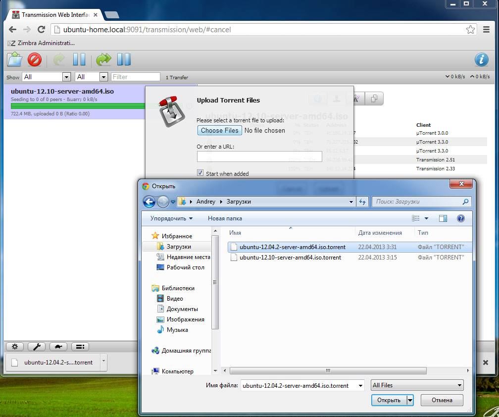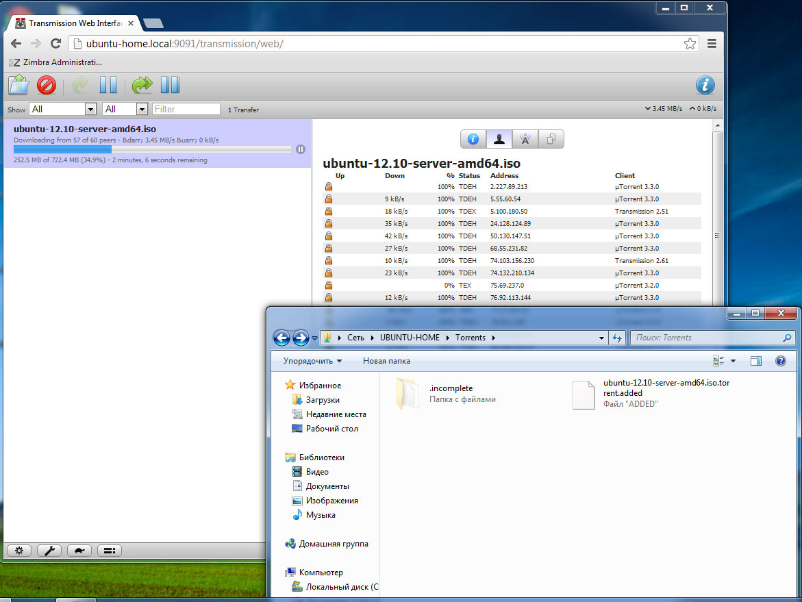 и зайти в веб-интерфейс, набрав в браузере адрес http://ubuntu-home.local:9091. Для проверки поместим в общую папку Torrents торрент-файл, если все сделано правильно то к его имени добавится расширение added и начнется закачка, а в папке .incompleted появится закачиваемый торрент.