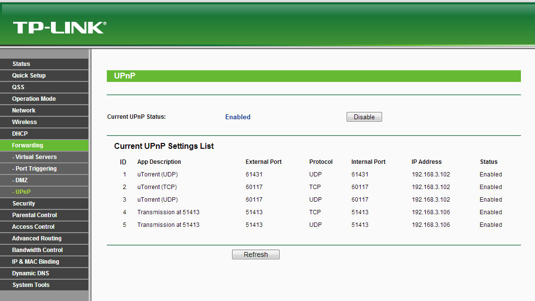 Перезагрузим сервер. В нашем случае (тестовая лаборатория) данный сервер расположен за NAT, войдя в веб-интерфейс роутера можем убедиться, что NAT не помеха, UPnP работает и позволяет принимать внешние подключения.