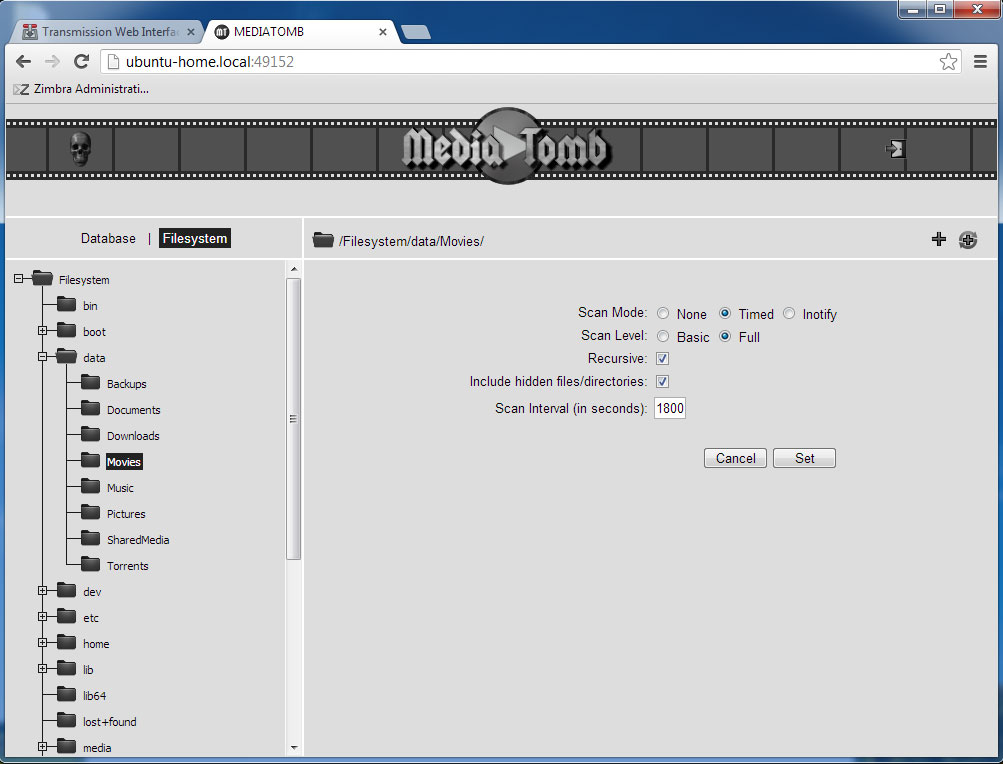 Но подключаться к нему еще рано, необходимо создать библиотеки мультимедиа. Для этого зайдем в веб-интерфейс http://ubuntu-home.local:49152 и перейдем к дереву файловой системы. Выбрав папку с мультимедийным контентом можем добавить ее в библиотеку нажав на кнопку "плюс" справа или задать режим регулярного сканирования папки нажав на соседнюю кнопку где плюс изображен в окружении стрелочек.
