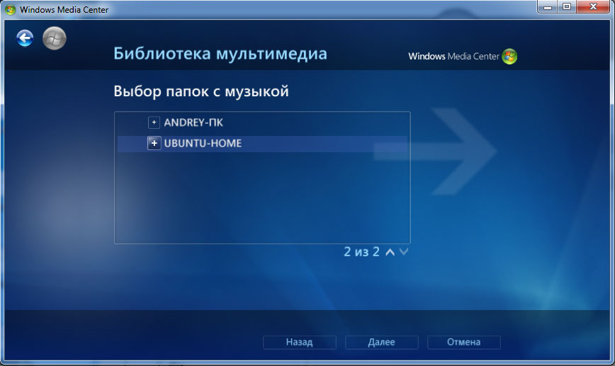 Для работы с медиасервером можно использовать любой поддерживающий DNLA клиент. Например Windows Media Center, работа с ним очень проста и не вызовет затруднений даже у неподготовленного пользователя. Добавляем библиотеку:
