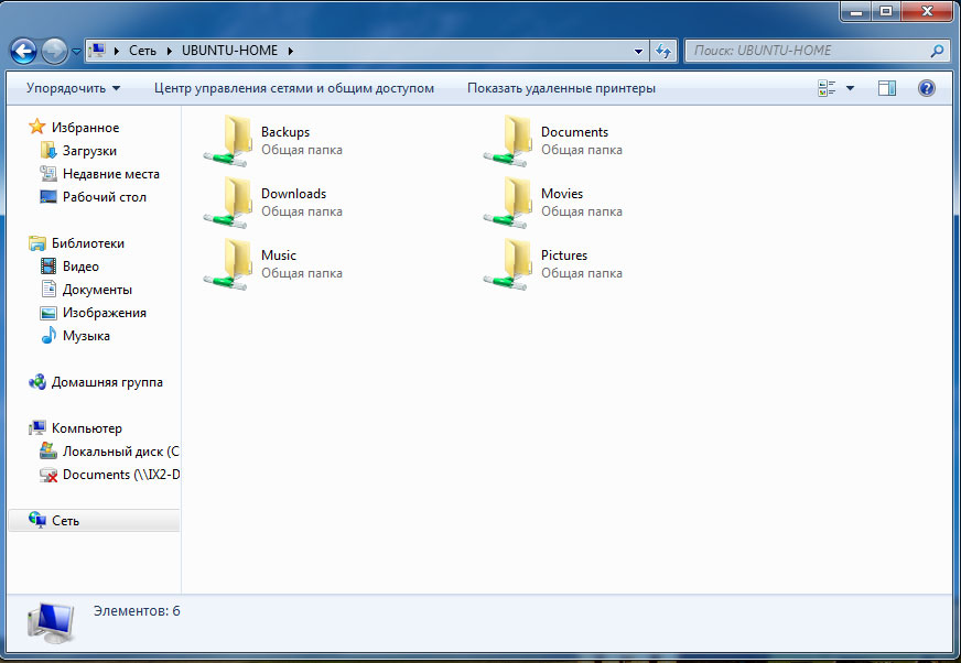 Наш сервер должен появиться в сетевом окружении и зайдя на него мы должны увидеть созданные нами общие папки.