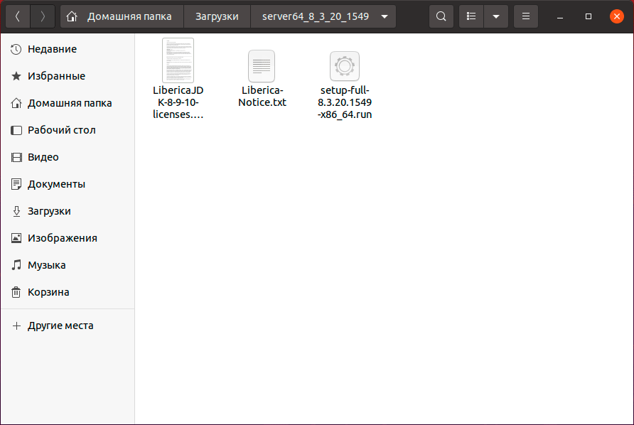 Архив с единым дистрибутивом имеет наименование вида server64_8_3_20_1549.tar.gz, где 64 указывает на архитектуру пакета, а 8_3_20_1549 - является версией платформы. Распаковав его, мы обнаружим .run файл дистрибутива платформы и два файла с описанием и лицензией для Liberica JDK, входящей в состав дистрибутива.
