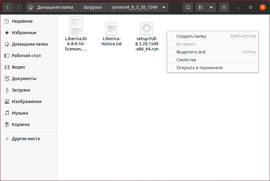 Хорошо, запускаем в папке с дистрибутивом терминал, для этого можно кликнуть правой кнопкой мыши и выбрать во всплывающем меню пункт Открыть в терминале: