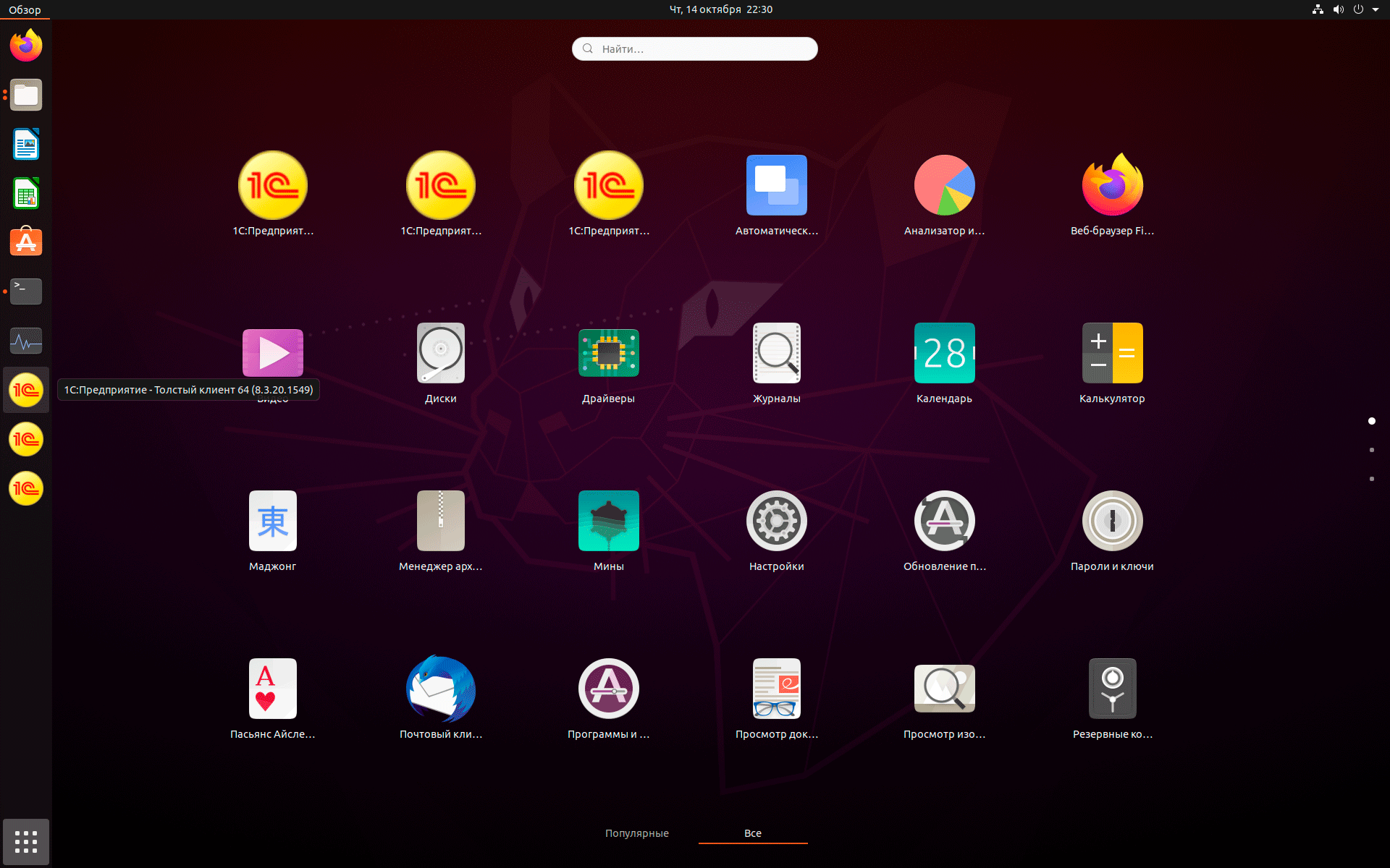 После установки будут добавлены ярлыки для программы запуска, толстого и тонкого клиента. Они относятся к подкатегории Finance категории Office. В окружении рабочего стола Gnome, который используется по умолчанию в Ubuntu и Debian, ярлыки добавляются в общую панель запуска и определить какой из них за что отвечает с первого взгляда довольно сложно, но если добавить их в Избранное (на боковую панель), то появляется всплывающая подсказка. Таким образом можно выяснить, что ярлыки идут в следующем порядке: толстый клиент, тонкий клиент, программа запуска. Запускать 1С:Предприятие следует через третий ярлык, его же советуем вывести в Избранное.