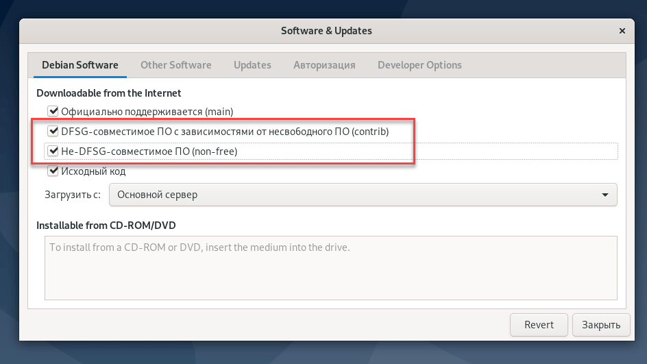 Несмотря на заявленный контроль зависимостей инсталлятор не проверяет наличие шрифтов Microsoft Core Fonts и никак не сообщает об этом. Но, к счастью, это несложно исправить. Обратите внимание, что данные шрифты относятся к несвободному ПО и в Debian вам потребуется подключить репозитории. Это можно сделать как в графическом режиме, запустив приложение Software & Updates и выбрав в нем репозитории contrib и non-free: