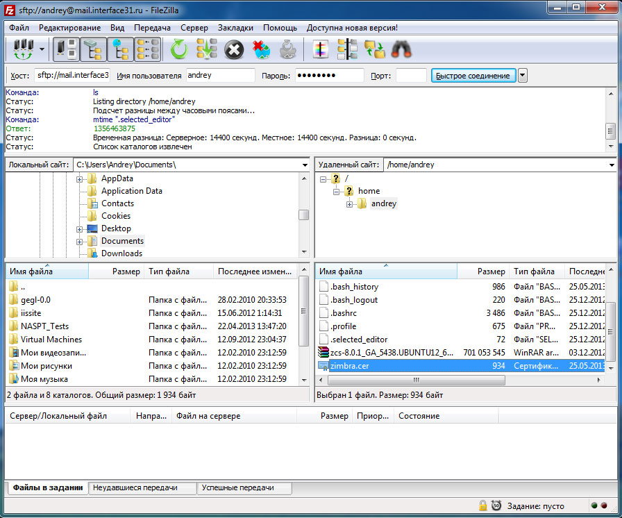 После чего корневой сертификат Zimbra будет находиться в домашней папке вашего пользователя. Чтобы скачать его можно воспользоваться любым клиентом, позволяющим передавать файлы через ssh. Например популярным FTP-клиентом Filezilla. В параметрах подключения укажите адрес сервера, учетные данные вашего пользователя и порт подключения 22. После подключения вы сразу окажетесь в своей домашней папке и сможете без проблем скачать сертификат.