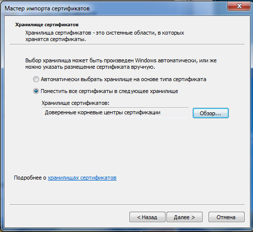 Теперь установим его на целевой системе, для этого нужно открыть сертификат двойным щелчком и выбрать Установить сертификат. Откроется мастер импорта сертификатов, работа с которым не представляет сложности. На этапе выбора хранилища ставим переключатель в положение Поместить все сертификаты в выбранное хранилище, где выбираем Доверенные коренные центры сертификации.