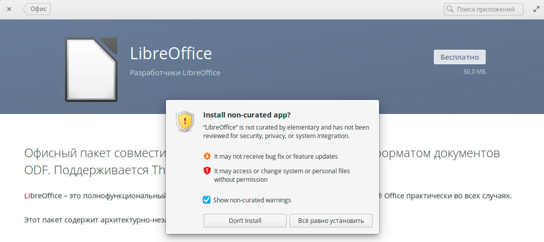 Попробуем что нибудь установить, допустим Libre Office, как один из пакетов первой необходимости. Но тут же получили достаточно пугающее предупреждение, несмотря на то что в качестве основных репозиториев системы используются официальные репозитории Ubuntu.