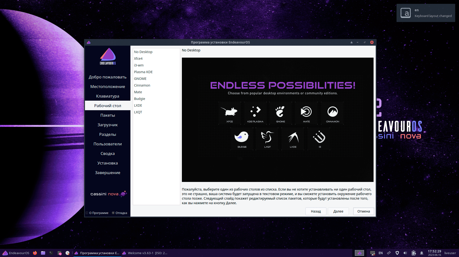 Начнем с установки, в качестве инсталлятора используется все тот же Calamares и загрузка с установочного образа в Live-режиме. Сразу предлагается два варианта установки: онлайн и оффлайн. В первом случае доступен обширный выбор рабочих окружений, но в ванильном виде, во втором безальтернативно XFCE с оформлением EndeavourOS. Ванильные оболочки мы много раз видели, поэтому будем ставить хоть и онлайн, но XFCE.
