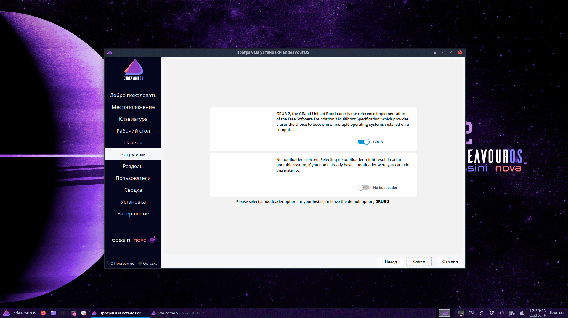 Хотите установить загрузчик? Или без него? Вопросы явно не для новичков, в случае неправильного выбора вполне можно получить на выходе неработоспособную систему. Ну новичков здесь не ждут, подразумевается, что типовой пользователь EndeavourOS хотя бы в общих чертах понимает, что делает.
