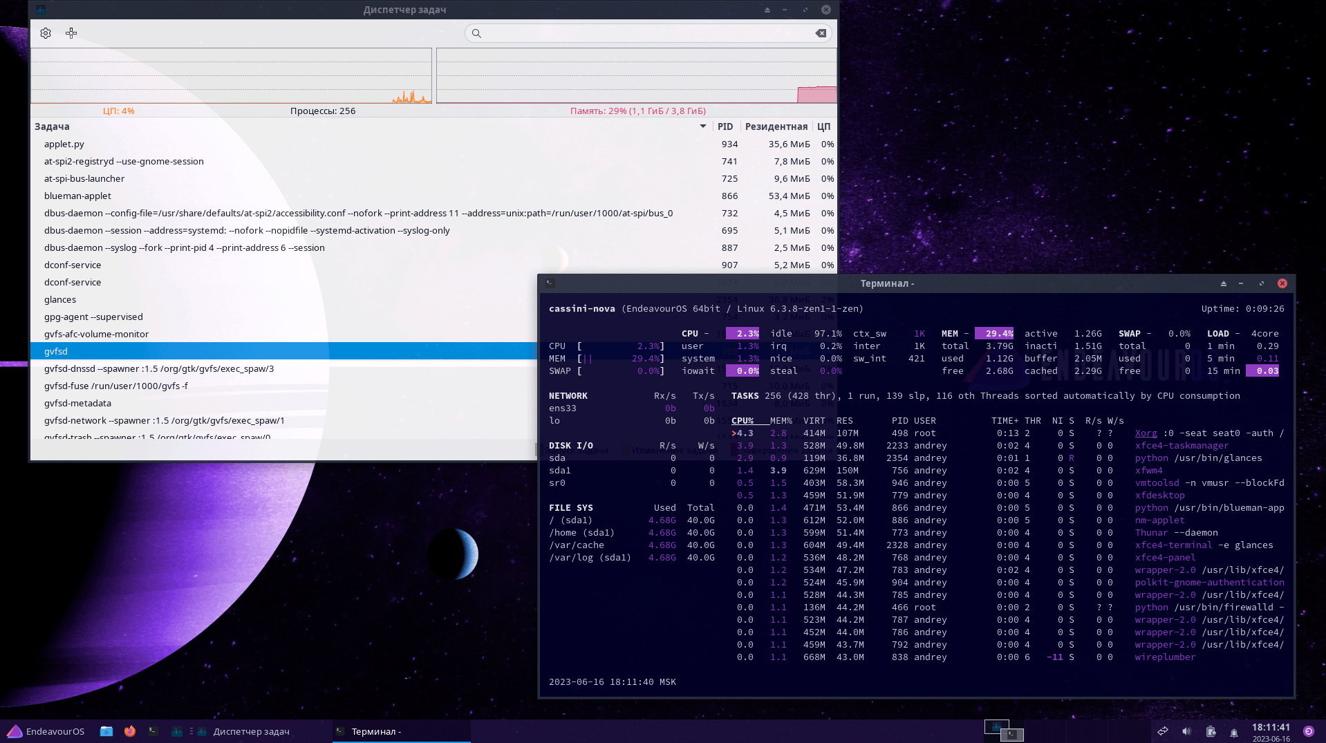 Системных мониторов тоже два, один стандартный XFCE, его можно найти в стартовом меню, а второй текстовый, запускается по значку на панели задач.