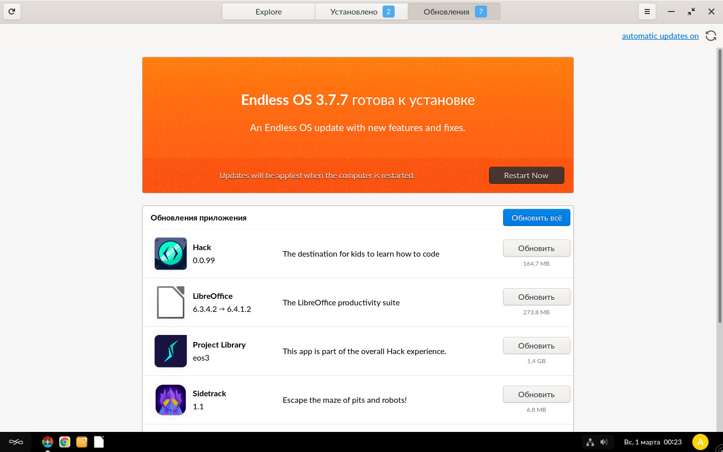 Обновление системы и приложений также следует этим традициям, здесь нет привычного пользователю Linux обновления пакетов, можно только целиком обновить систему и/или приложения:
