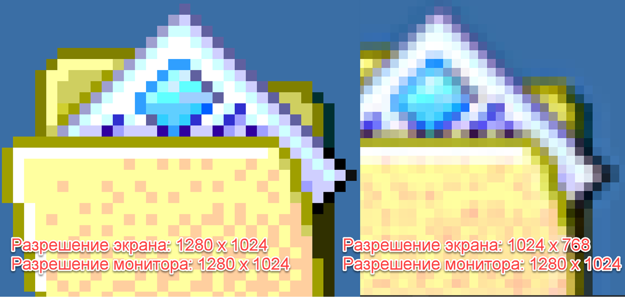 Что делал пользователь, если изображение казалось ему мелким? Он уменьшал разрешение, при этом уменьшалась плотность пикселей, и картинка становилась крупнее. Ниже, в качестве примера, мы выразили в одном масштабе два разрешения для ЭЛТ-монитора в 17" (видимая область 16,5").
