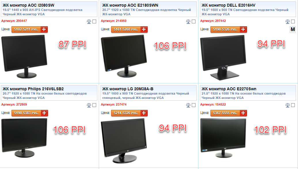 Как несложно заметить, все модели с разрешением 1920 х 1080 имеют повышенную плотность пикселей, а следовательно, изображение на них будет мелким. Но есть и иные подводные камни. Если мы посмотрим на 19,5" модели, то можем заметить, что одна из них имеет низкую плотность пикселей в 87 PPI, т.е. картинка на нем будет более крупная и заменив такой монитор на такую же по диагонали модель, но с нормальной плотностью пикселей в 94 PPI вы можете столкнуться с заявлением, что картинка на мониторе мелкая.