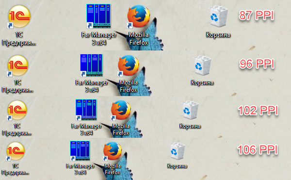 Но разговор сейчас не об этом, со временем 96 PPI стали стандартом де-факто и вокруг этих значений строились все традиционные графические интерфейсы - размеры кнопок, иконок, шрифтов и прочих элементов рабочего окружения. Долгое время это не вызывало никаких проблем, так как стандартные разрешения для типовых размеров диагонали мониторов давали итоговую плотность пикселей близкую к 96 PPI и шрифты, и интерфейсные элементы были везде примерно одного размера.