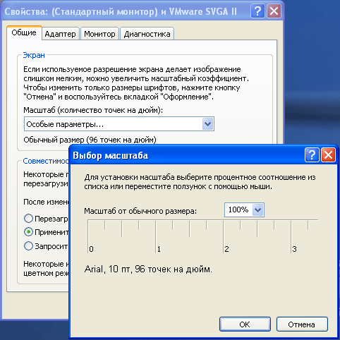 Одним из первых методов является Масштабирование в стиле Windows XP, который предусматривает масштабирование шрифтов и отдельных элементов интерфейса (ярлыки, курсоры и т.п.). Мы думаем, что с данным типом масштабирования хоть раз сталкивался каждый. Но не все знают, что можно приложить к экрану дюймовую линейку и точно выставить масштаб ползунком мыши.