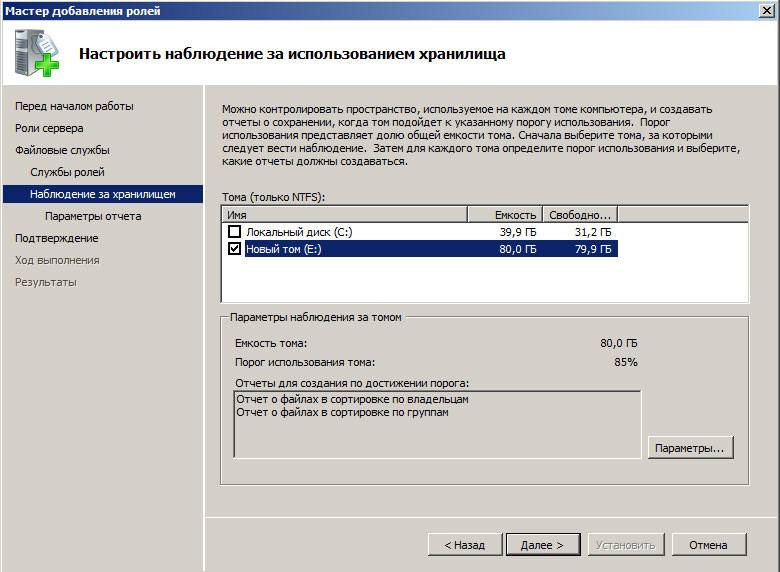 Как видим выбор довольно богат, не будем пока трогать продвинутые службы, каждая из которых требует, минимум, отдельной статьи, а установим собственно службы Файлового сервера и Диспетчера ресурсов. Следующим шагом нам будет предложено настроить наблюдение над томами хранилища. Настраивать наблюдение за системным диском мы не видим смысла, поэтому выбираем только те тома, которые будут использоваться для хранения пользовательских данных.