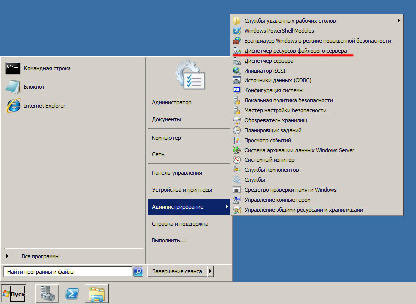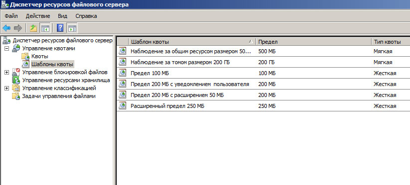 Завершим установку роли и создадим необходимые общие ресурсы. Но не спешите открывать доступ пользователям, сначала посмотрим какие возможности по управлению хранилищем предоставляет нам система. Для этого запустим Диспетчер ресурсов файлового сервера.