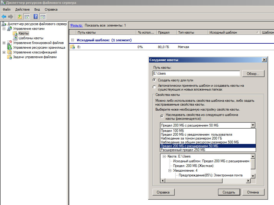 Для любого общего ресурса или папки на томе можно создать свою квоту, при создании квоты можно использовать один из шаблонов или установить все параметры вручную. В нашем случае мы создали для папки Users жесткую квоту 200+50 Мб, по превышению квоты администратор будет уведомлен, а пользователь сможет записать еще 50 Мб, после чего запись будет блокирована.