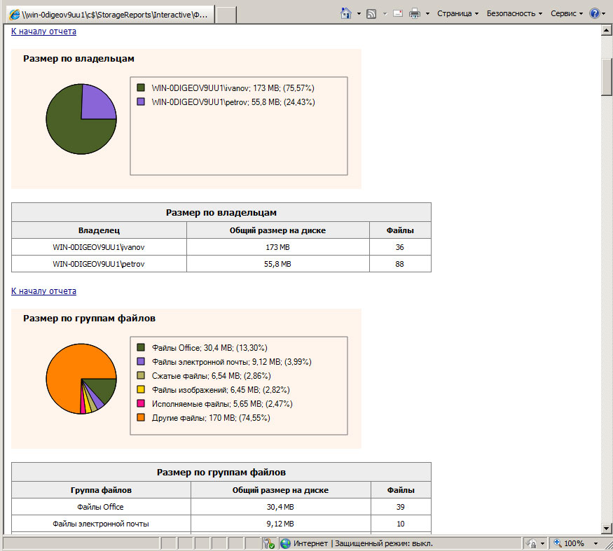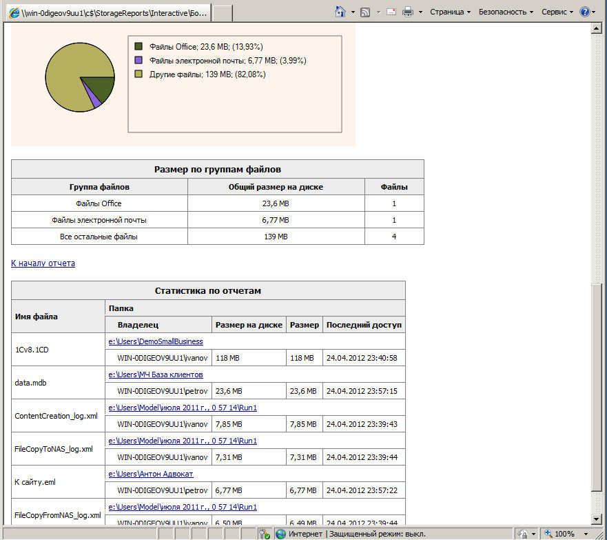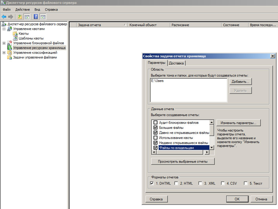 Как видим все работает и админ может спать спокойно. Но наш рассказ будет неполным, если не рассказать об отчетах, которые раскрывают перед администратором широкие возможности контроля и анализа использования файлового хранилища. Каждый из вас наверное ни раз задавался вопросом: кто из пользователей занял все место и чем именно. Теперь получить ответ можно за считанные минуты, для этого переходим в раздел Управление ресурсами хранилища и создаем новый отчет, в котором указываем интересующие нас показатели, также можно настроить автоматическое формирование необходимых отчетов по расписанию.
