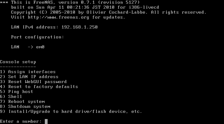 FreeNAS доступен для скачивания на официальном сайте проекта, на момент написания статьи последней версией была 0.7.1. Основным вариантом поставки служит LiveCD, загрузившись с которого мы получим полностью работоспособную систему, это очень удобно когда нужно быстро развернуть временное сетевое хранилище, например для обеспечения мероприятия, в учебных или демонстрационных целях. Однако стоит помнить, что настройки будут действовать до первой перезагрузки, поэтому лучше установить систему на жесткий диск, тем более что это не занимает много времени.
