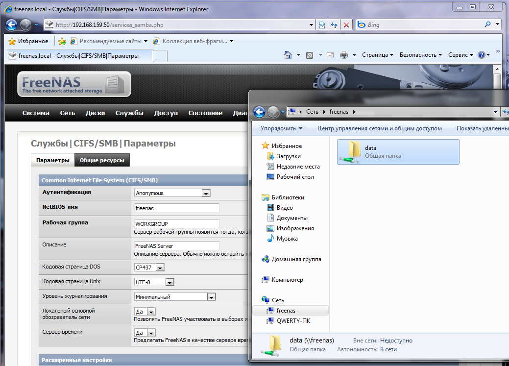 Настроить общий доступ во FreeNAS не просто, а очень просто (Службы - CIFS/SMB). Нам нужно указать всего три обязательных параметра (или оставить их по умолчанию) на закладке Параметры и подключить одну (или несколько) из наших точек монтирования в качестве общего ресурса на закладке Общие ресурсы. Все, сетевое хранилище готово, можно размешать файлы.