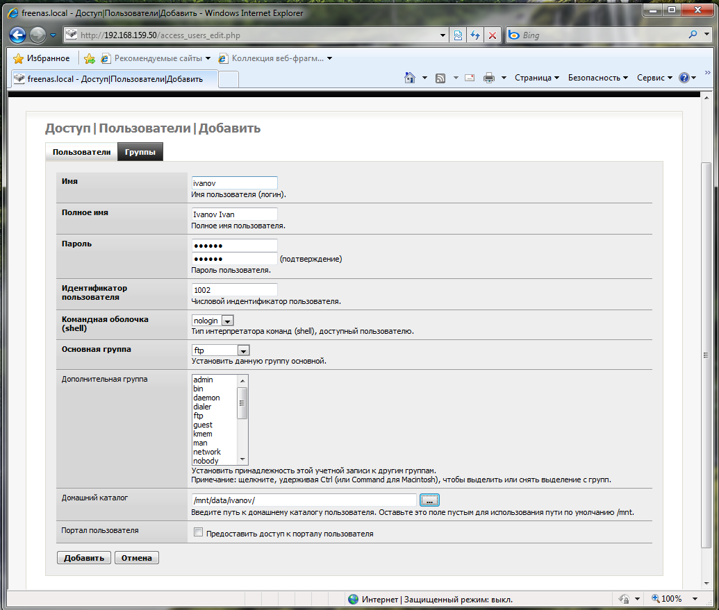 Добавить пользователя можно в меню Доступ - Пользователи и группы вводим имя пользователя, полное имя, желаемый пароль. В качестве основной группы указываем ftp, ниже указываем желаемый домашний каталог, если он не существует, то будет создан.