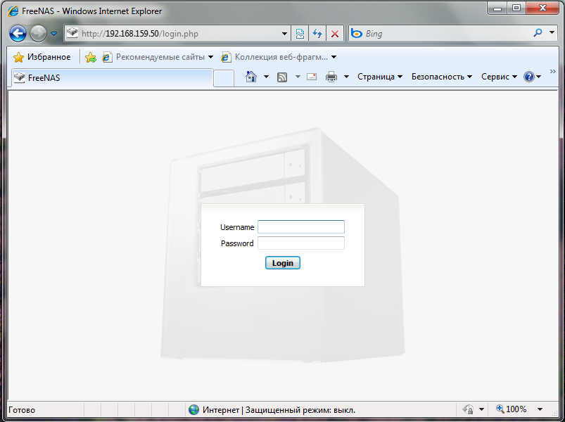 Для того, чтобы проверить работоспособность сети вводим в браузере на клиентской машине IP адрес хранилища, если все работает нормально, вы увидите окно входа в веб-интерфейс. Теперь можете смело задвигать хранилище на полку в серверной (или убирать на антресоль), все остальные настройки доступны через веб-интерфейс.