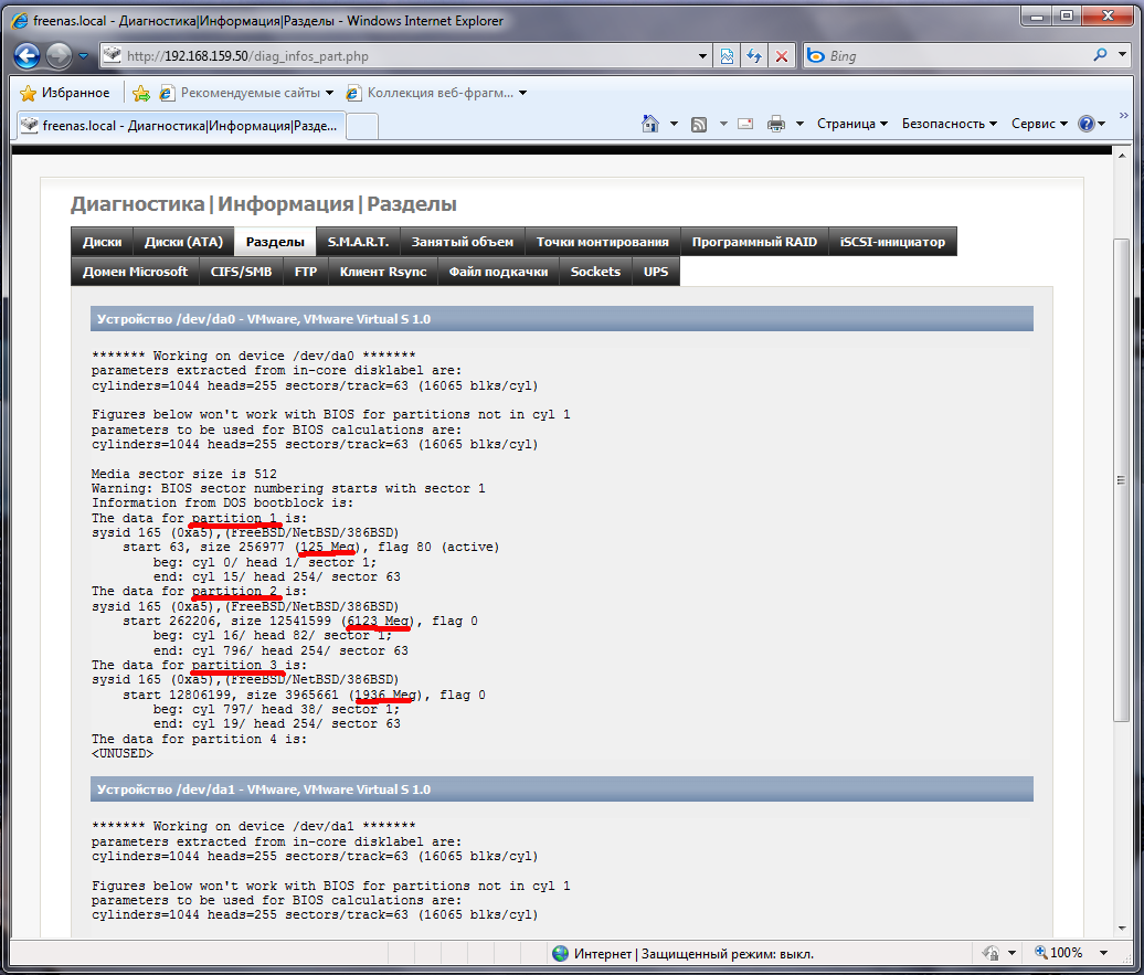 Открываем Диагностика - Информация - Разделы и внимательно изучаем представленную информацию. Как видим в системе установлены два жестких диска da0 и da1, первый из которых является системным и уже размечен. В информации о разметке ищем номера разделов (partition) и их размеры.