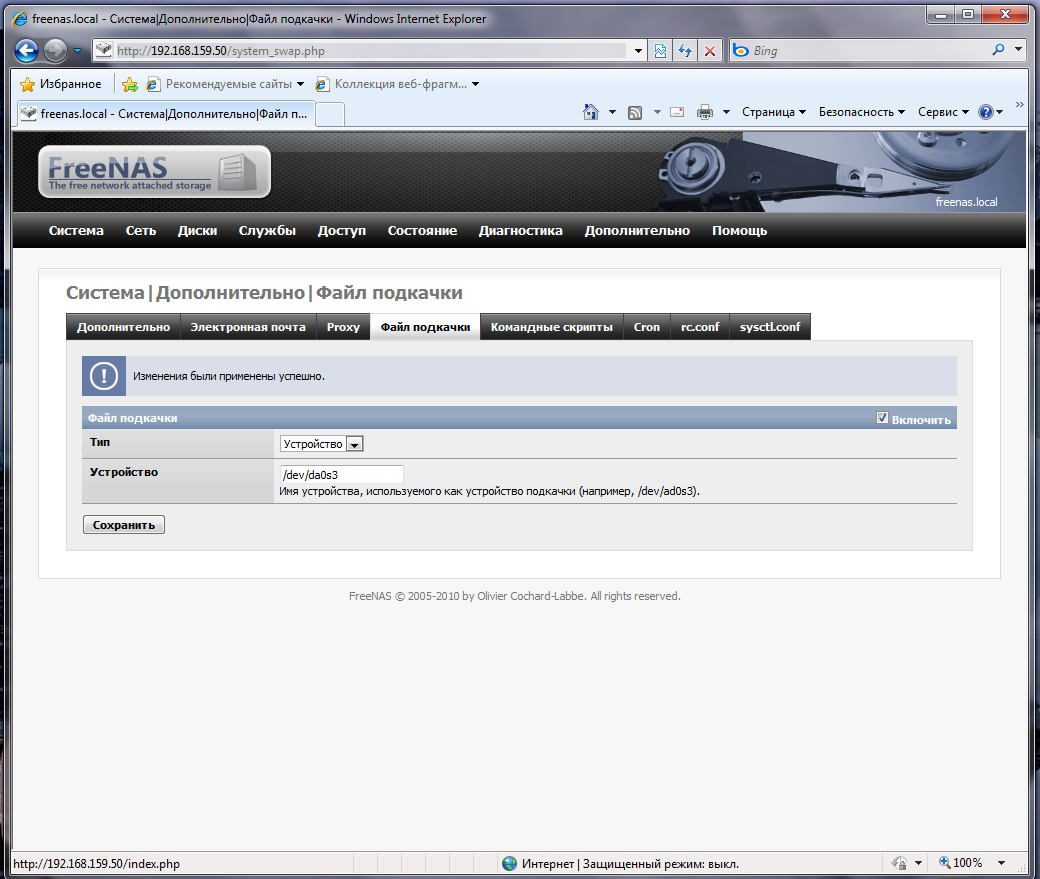 Теперь подключим раздел подкачки, несмотря на то, что программа установки его создает, автоматически он не монтируется. Переходим Система - Дополнительно - Файл подкачки, ставим галочку Включить, тип - устройство. В качестве устройства указываем существующий раздел подкачки, как мы установили - это третий раздел первого диска, следовательно полное наименование раздела будет da0s3, а полный путь /dev/da0s3.