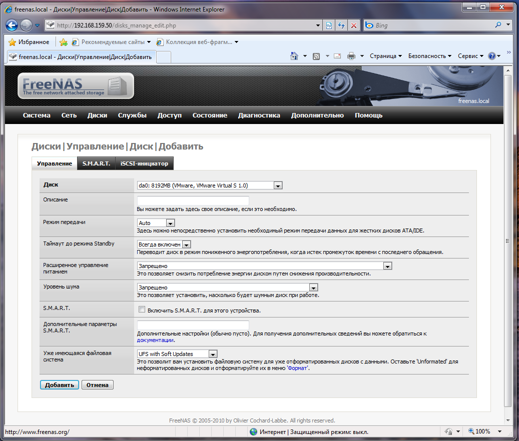 Выбираем физический диск (в нашем случае da0), указываем необходимые параметры (в 99% случаев можно все оставить по умолчанию). Так как наш диск уже размечен указываем в качестве файловой системы UFS with Soft Updates, затем жмем Добавить и подтверждаем изменения на следующей странице.