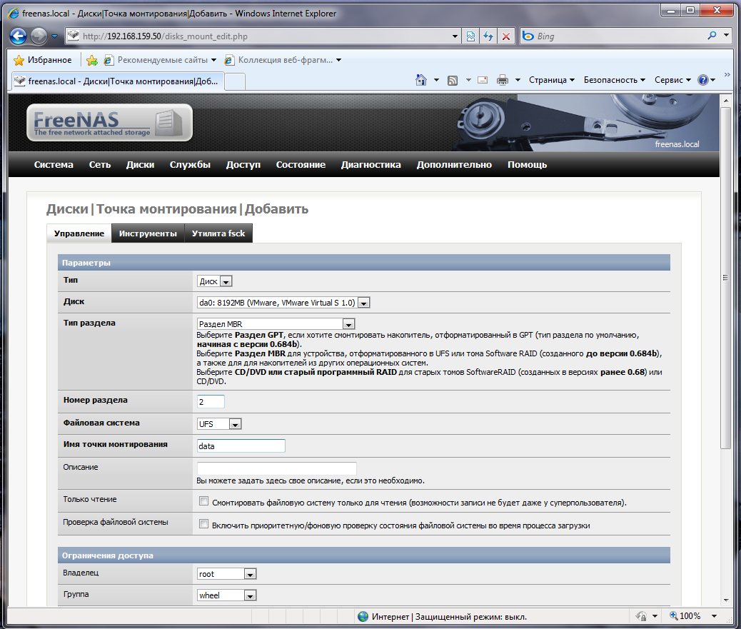 Подключив диск нужно указать точку монтирования раздела для пользовательских данных. Диски - Точка монтирования - Добавить (синий плюс), указываем диск (da0) - тип раздела (для загрузочного диска MBR) - номер раздела (в нашем случае 2, см. "шпаргалку") - тип файловой системы (UFS) и имя точки монтирования (придумайте сами, мы выбрали data).