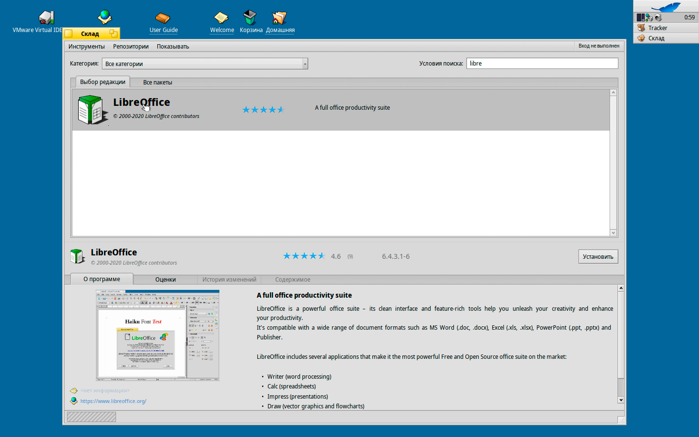 В этот раз никаких проблем с установкой ПО у нас не возникло. Пакетный менеджер корректно определил требуемые зависимости и произвел их установку. Сам же LibreOffice в Haiku ничем не отличается от того, к которому мы привыкли в традиционных системах.
