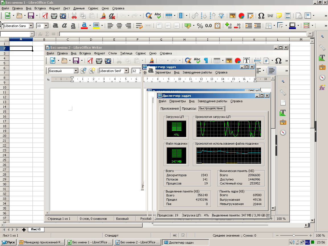 Может быть попробуем поработать? Нет, честно, мы ничего еще не делали, просто открыли два окна LibreOffiсе, получив загрузку процессора в 100% и жуткие графические артефакты по экрану.