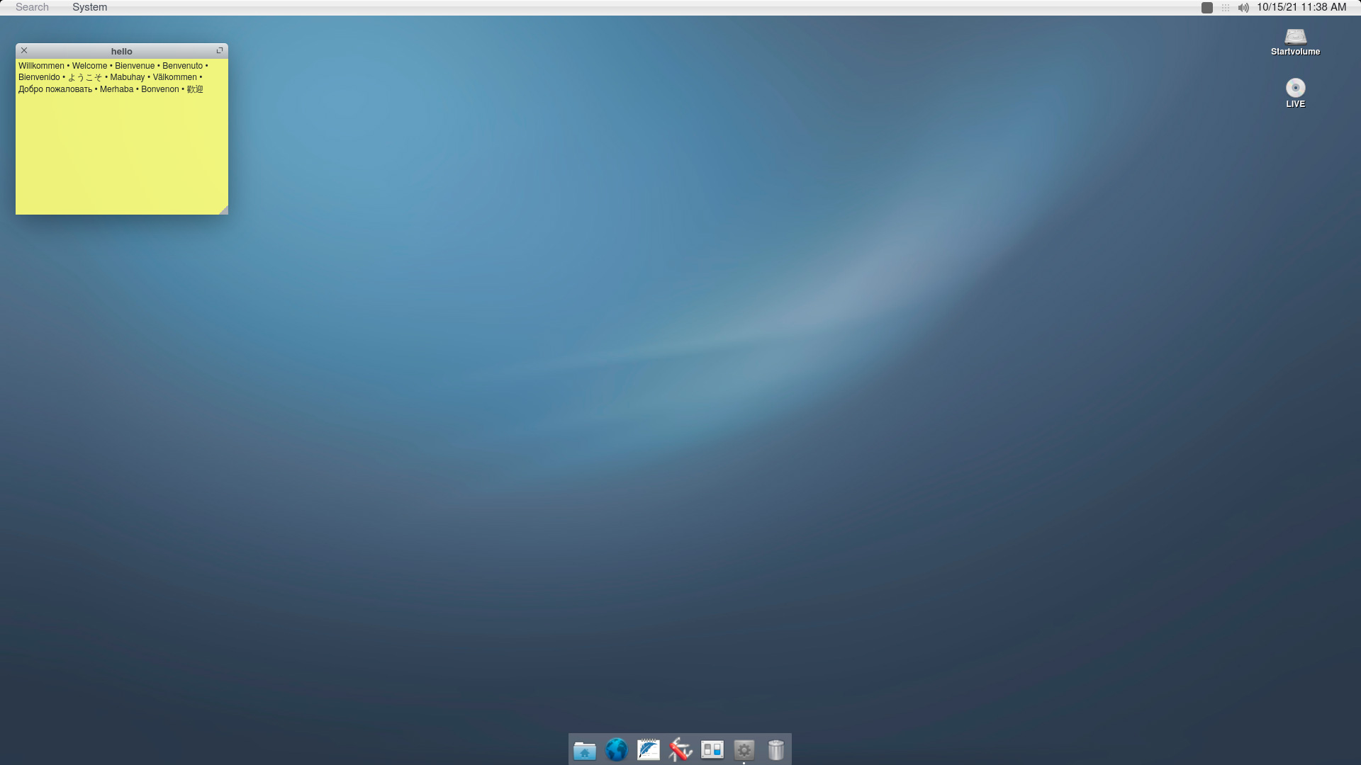 Для ознакомления мы скачали ISO-образ с последней версией системы r0.6.0, который можно запустить в режиме живого диска, но сделать это можно только при условии наличия в системе 4 ГБ оперативной памяти (или более), поэтому назвать системные требования скромными нельзя. Загрузку образа нельзя назвать быстрой и по ее завершении мы попадаем на рабочий стол со стикером содержащим приветствие на разных языках, что оригинально обыгрывает наименование системы.