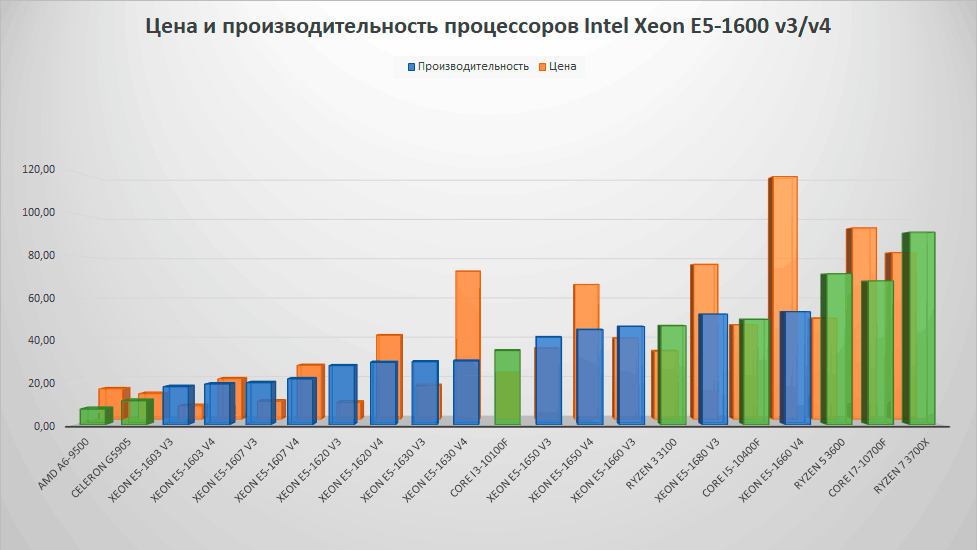 Что сразу обращает на себя внимание? Разница в производительности между v3 и v4, она достаточно невелика, чего нельзя сказать о разнице в цене. Xeon Е5 v4 стоит дорого, иногда запредельно дорого, как пример E5-1660 v4. Никакого смысла в покупке процессоров четвертого поколения мы не видим, разве что вам нужен именно v4 в серверную систему, в таком случае покупка в Китае может иметь определенный экономический смысл. Далее мы будем рассматривать именно процессоры v3.