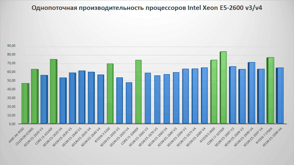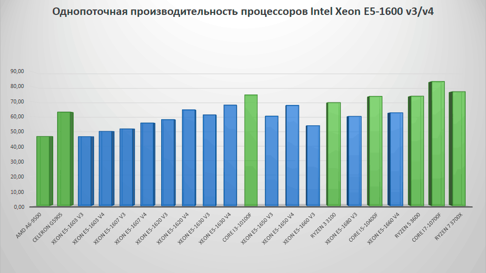 Возможно, многие удивятся, что в однопоточном тесте дешевый Celeron не уступает более дорогим процессорам и превосходит или идет на равных с практически всеми Xeon E5-1600. Но ничего удивительного в этом нет, все процессоры одного поколения производятся на одной и той же аппаратной базе. Основу стоимости процессоров составляет далеко не кремний, а затраты на разработку (НИОКР или R&D), поэтому экономически выгодно даже в дешевых процессорах использовать те же ядра, что и в дорогих, просто программно или аппаратно ограничивая их возможности.