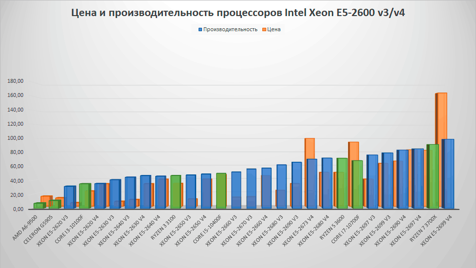 Еще один момент, который стоит внимания - это ценообразование китайских продавцов, мы специально включили в сравнение E5-2673 v4. Чем примечателен это процессор? Если смотреть на производительность - то ничем, но в нем не 14, а 20 ядер и не 28, а 40 потоков. Этого уже вполне достаточно чтобы продавцы на китайских площадках загнали ценник на него до абсолютно неадекватных значений.