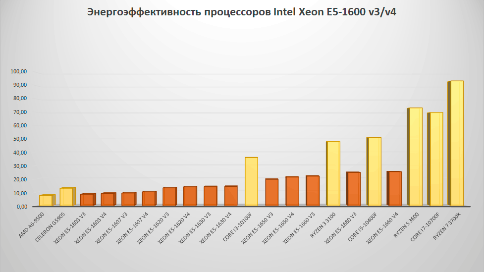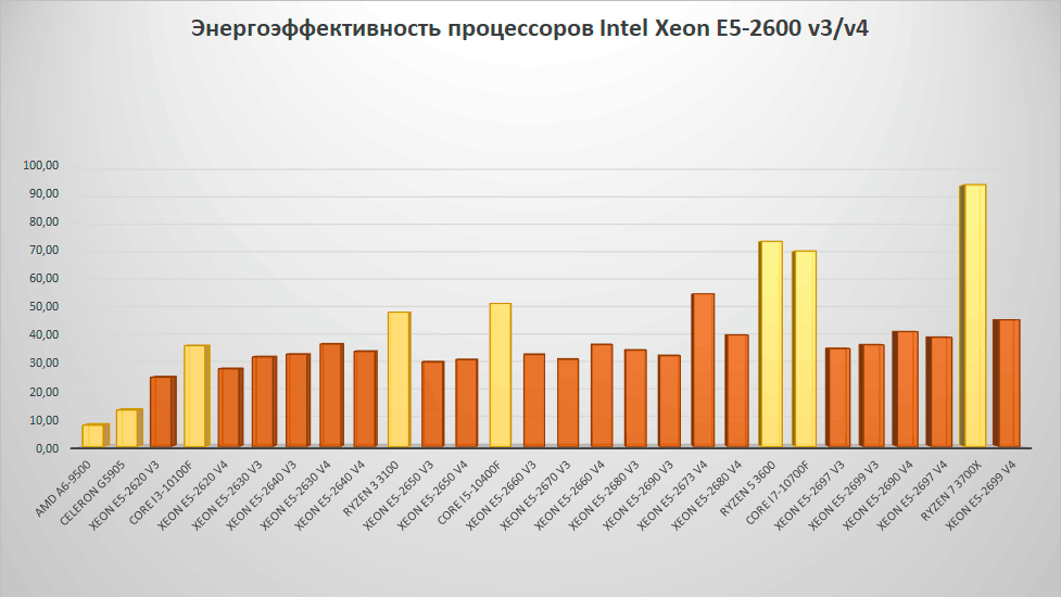 Здесь картина уже немного получше, хотя энергоэффективность большинства процессоров не превышает уровень дешевых Core i3, тем не менее модели этой линейки в специфических для них задачах способны показывать гораздо более высокую производительность, на уровне Ryzen 5 или Core i7, а учитывая крайне невысокую их цену затраты на эффективное охлаждение все еще укладываются в понятие бюджетного решения. Тем более что в интересной для покупки части линейки потребляемая мощность находится в пределах 85 - 120 Вт, что позволяет обойтись относительно недорогими моделями кулеров.