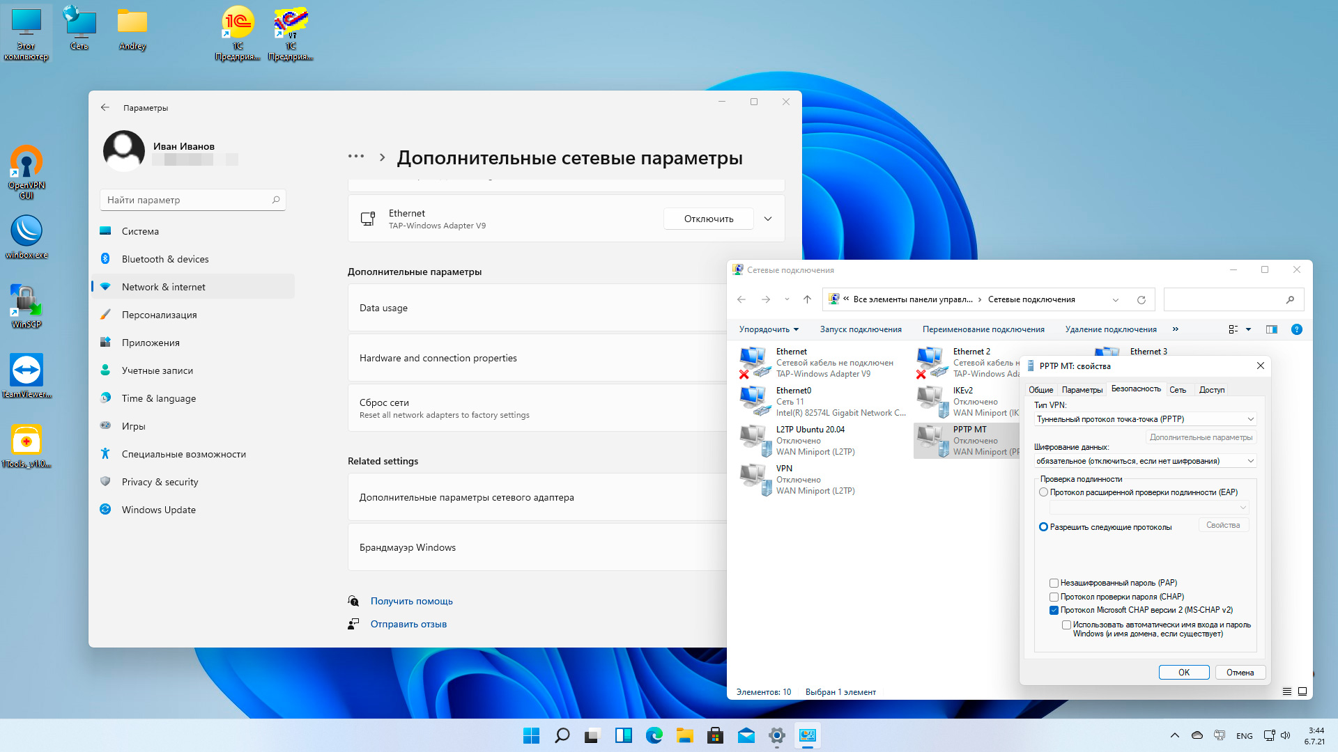 Но если вы захотите настроить что-то большее, чем просто IP-адрес или логин/пароль для VPN подключения - то придется снова возвращаться к классическому представлению сетевых адаптеров, для чего придется проделать достаточно длинный путь. Перейти в раздел дополнительных сетевых параметров и еще раз выбрать Дополнительные параметры сетевого адаптера. Если считать от значка в панели задач, то нужно три клика мыши и две прокрутки экрана в самый низ.