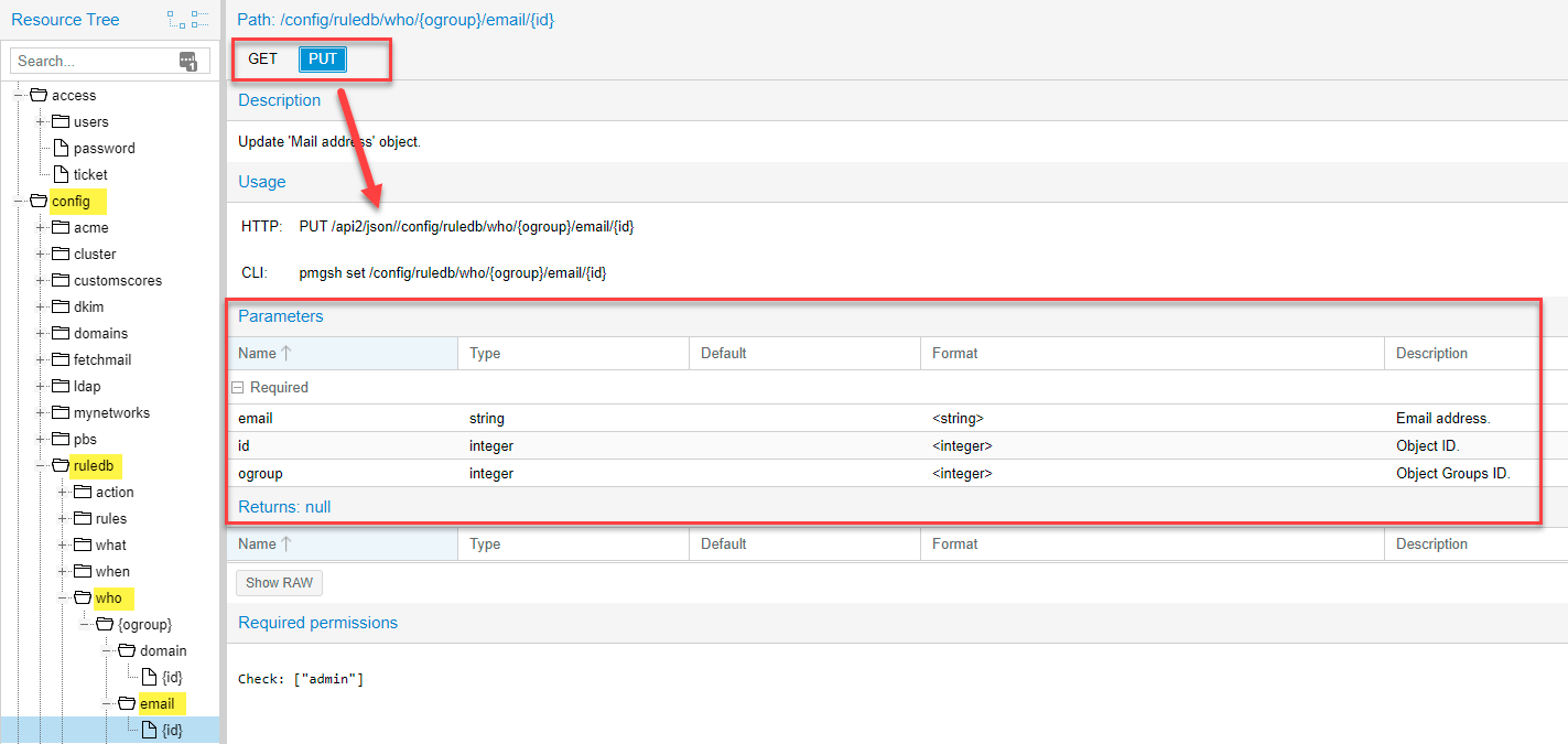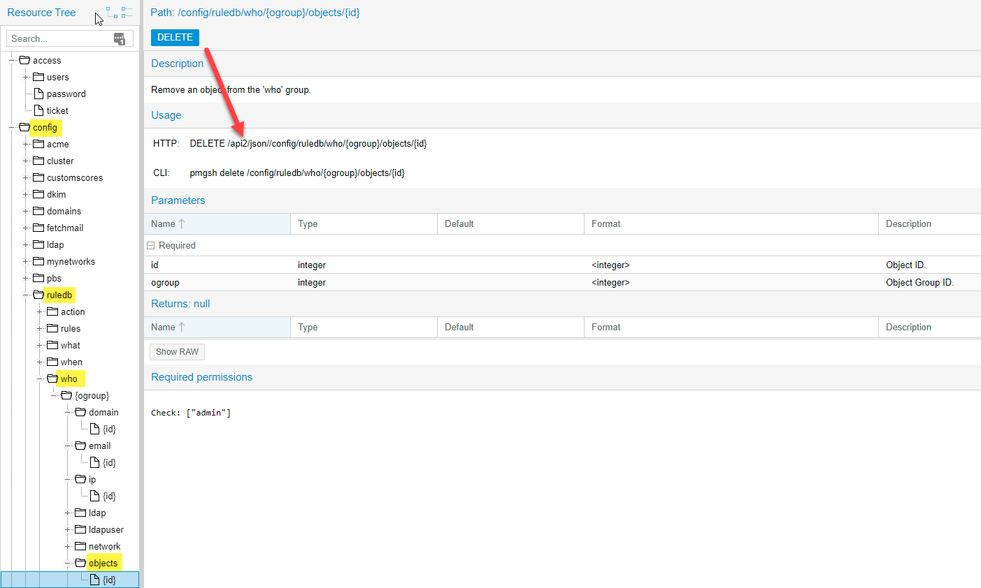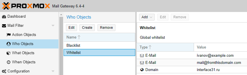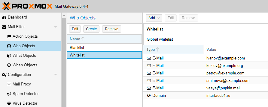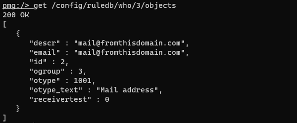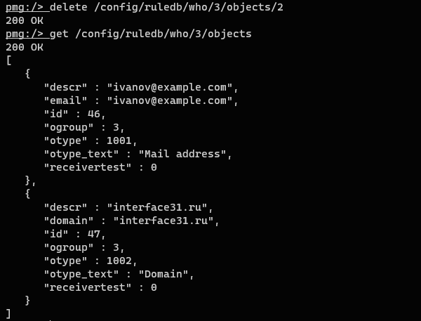 Пока в нем находится один единственный адрес, добавленный разработчиками для примера. Еще одна тонкость, для получения состава списка мы использовали objects, потому как для отдельных видов записей, таких как email, domain или ip действие get недоступно, только create. Чтобы не путаться в доступных действиях всегда смотрите документацию, она должна стать вашей настольной книгой при работе с API Proxmox Mail Gateway.