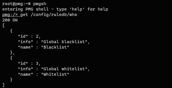 Для работы через интерфейс командной строки предназначена специальная утилита pmgsh, есть два варианта ее использования: можно использовать ее как команду, каждый раз передавая ей параметры, либо запустить как отдельную консоль и работать с ней интерактивно, последний вариант, если вы работаете руками, более удобен, так как в нем будет действовать автодополнение по Tab.
