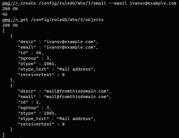 В данной команде мы указали ogroup - 3, т.е. белый список, затем уточнили, что создаем объект email и через двойной дефис указали добавляемый параметр и его значение. Затем можем снова запросить список объектов белого списка и увидеть, что в него добавлен еще один адрес.