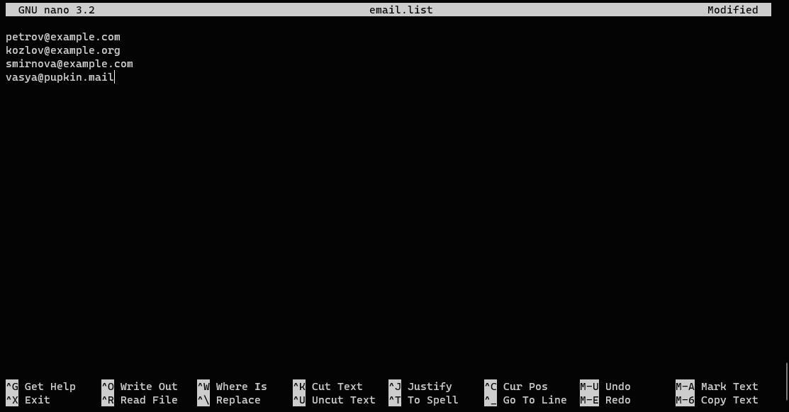 Давайте для примера создадим аналог такого списка. Перейдем в домашнюю директорию и создадим новый файл, в который внесем необходимые нам электронные адреса: